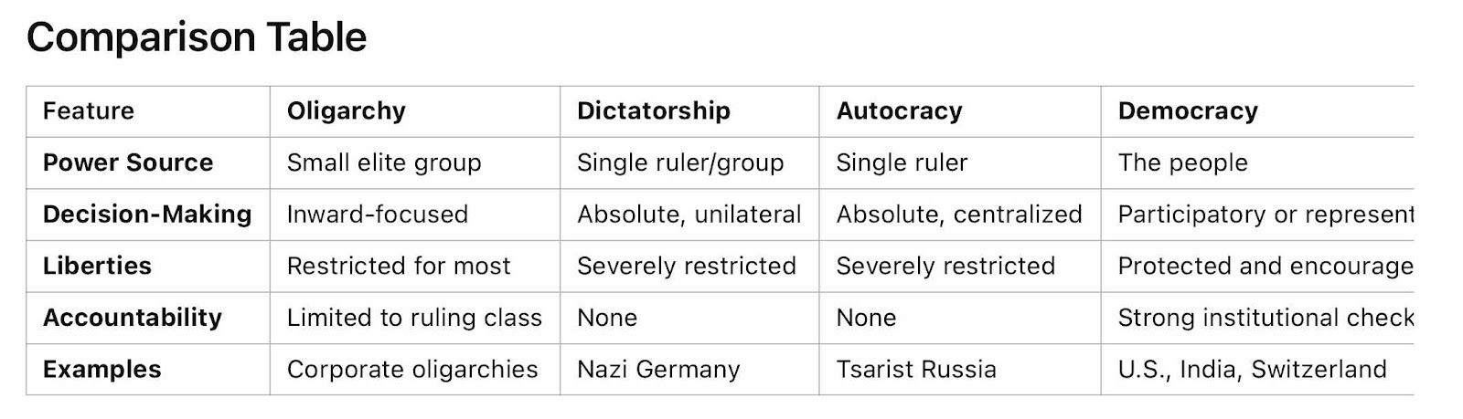 Here’s an overview of the differences between oligarchy, dictatorship, autocracy, and democracy, including key characteristics and references to political theory, just in case you wanted to know: