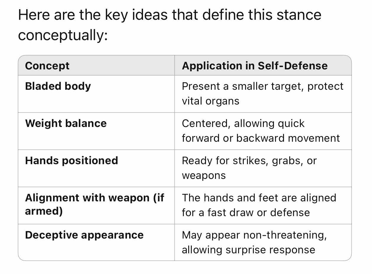 • In karate or krav maga, a “bladed” stance is used to present less target area and prepare for both striking and evasion.